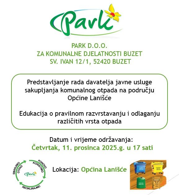 Općina Lanišće poziva sve mještane na informativno predavanje Park d.o.o. Buzet, na kojem će se predstaviti rad davatelja javne usluge sakupljanja komunalnog otpada na području naše općine.