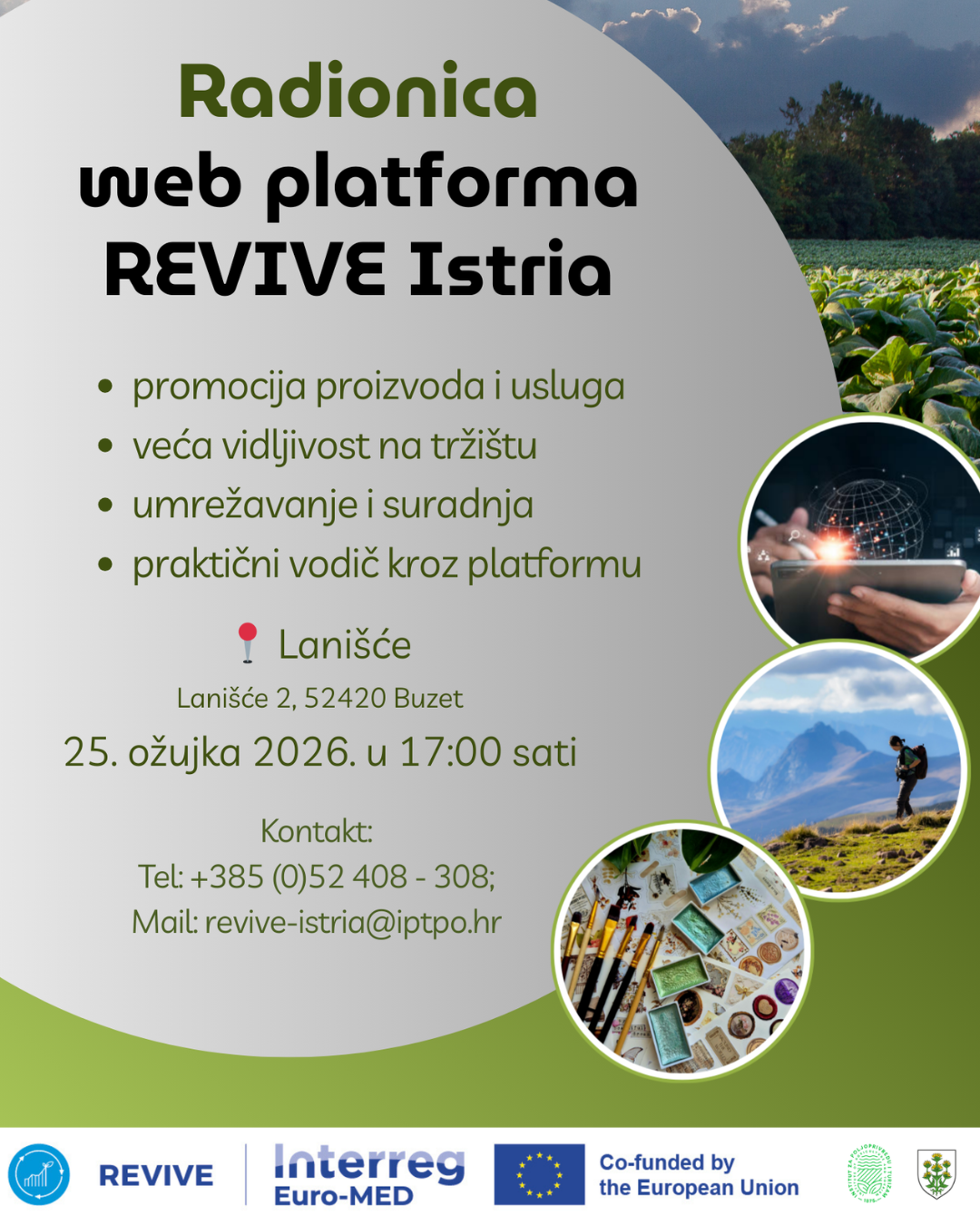 Pozivaju se svi zainteresirani poduzetnici, obrtnici, iznajmljivači, ugostitelji, poljoprivrednici, kreativci i ostali poslovni subjekti na radionicu predstavljanja web platforme REVIVE Istria.