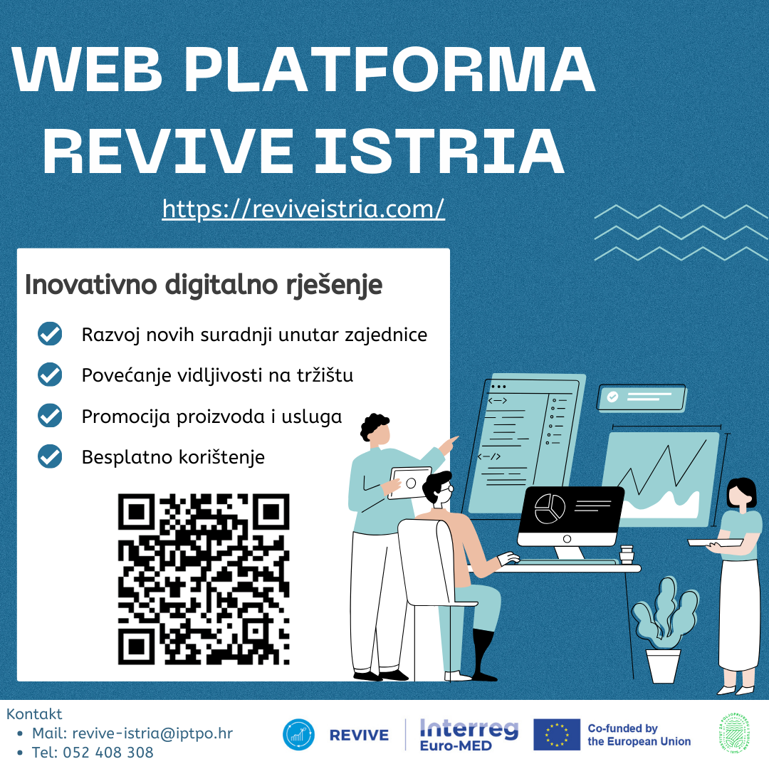 U sklopu projekta Interreg Euro-MED REVIVE, Institut za poljoprivredu i turizam iz Poreča, osmislio je poslovno digitalno rješenje – web platformu koja povezuje poslovne subjekte koji djeluju u poljoprivredi, turizmu i ugostiteljstvu, kreativnoj industriji i ostalim djelatnostima unutar naše zajednice s ciljem jačanja suradnje, vidljivosti na tržištu i konkurentnosti destinacije.